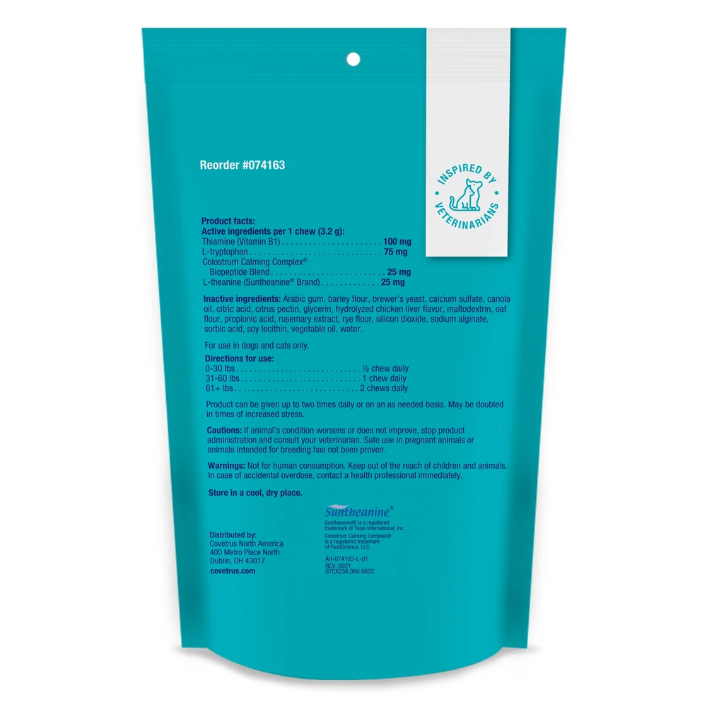 Help promote relaxation and peace of mind in your pets with Covetrus Behavior Chews for Cats & Dogs. These chews feature ingredients proven to support balanced behavior: thiamine (Vitamin B1), Colostrum Calming Complex®, and L-theanine. Used as a supplement, it is suitable to double or triple the dose during times of added stress.