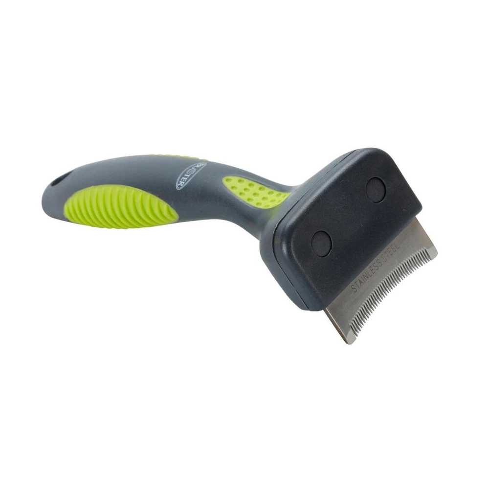 Avoid loose hair. The BUSTER DeShedder fast and easily removes loose hair much better than a normal brush or comb. Shedding is a normal process but with the BUSTER DeShedder comb you remove a big part of the coat of your pet before it sticks to your clothes, the floor, the couch or to something else in your house. Can be used for all kind of coats. Universal comb that easily removes the undercoat and loose hair. Reduces shedding. Formed after the pet’s contour for maximum effect. Keeps the coat healthy and fine.