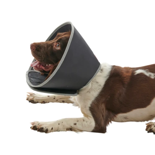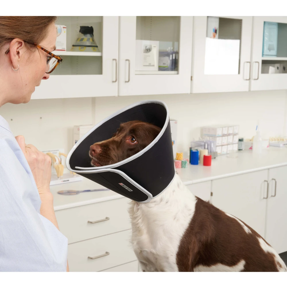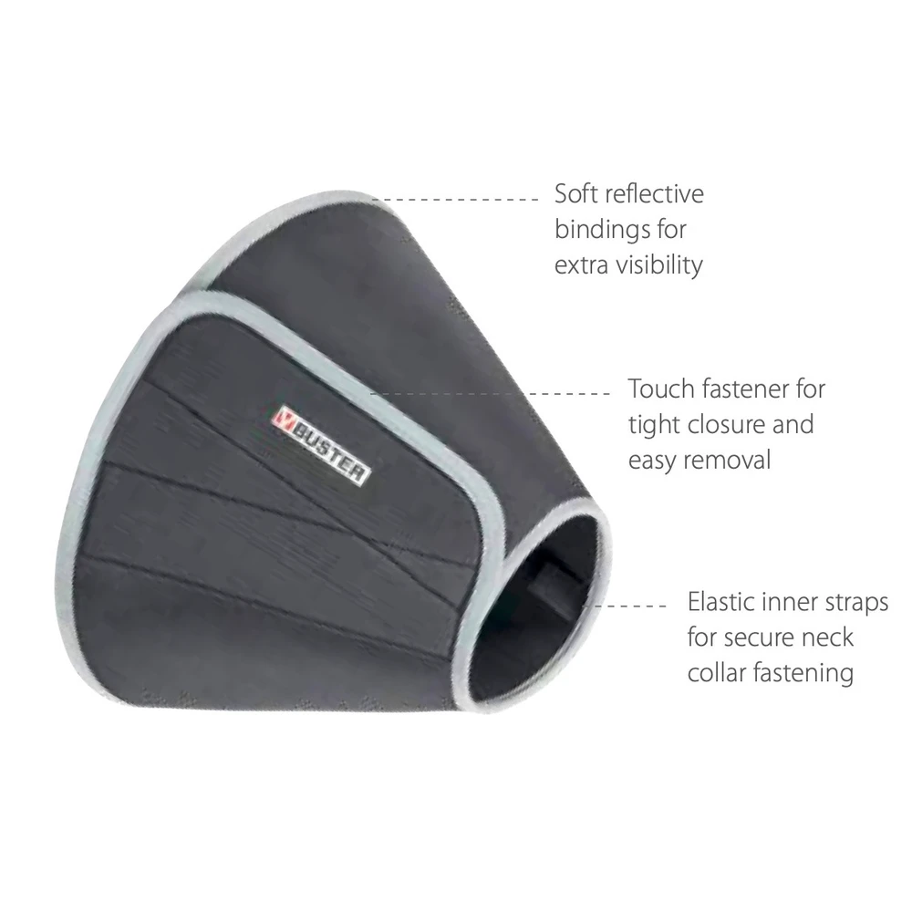 An alternative to the rigid standard E-collars for patient protection. Offers comfortable protection while recovering from surgery or minor injuries, in addition to restricting excessive licking, biting, or chewing. The inside and outside waterproof ripstop layer prevent claws from tearing the collar. Soft, reflective bindings for extra visibility. Touch fastener for tight closure and easy removal. Elastic inner straps for secure neck collar fastening.