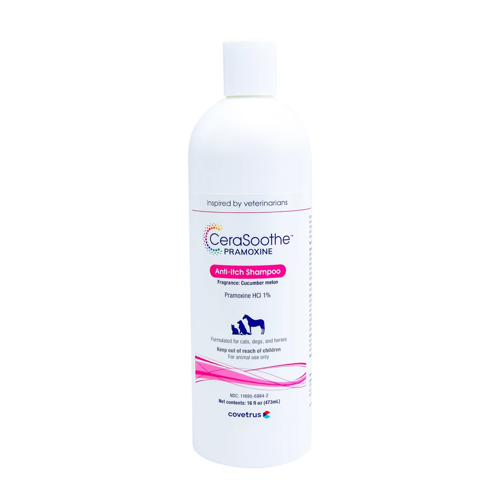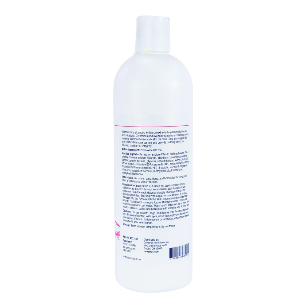 Cerasoothe Pramoxine Anti-Itch Shampoo: A conditioning shampoo with pramoxine to help relieve itching and skin irritations. Ceramides and avenanthramides are skin nourishing nutrients that moisturize and calm the skin. They also support the skin’s natural immune system and provide building blocks for renewed skin barrier integrity. For use on cats, dogs, and horses for the temporary relief of itching and skin irritations.