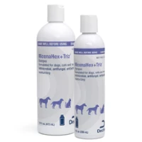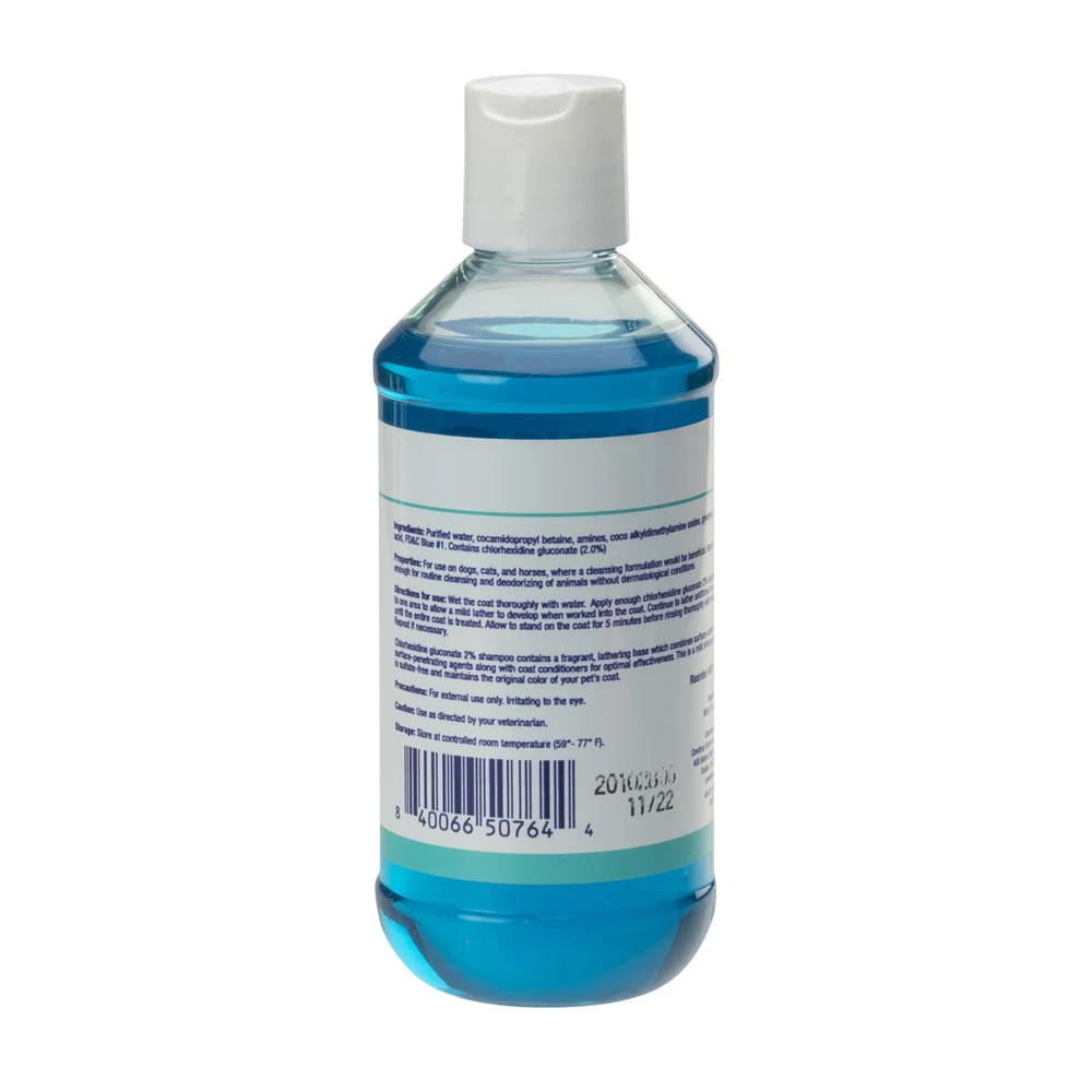 For use on dogs, cats, and horses, where a cleansing formulation would be beneficial. Gentle enough for routine cleansing and deodorizing of animals without dermatological conditions. Chlorhexidine gluconate 2% shampoo contains a fragrant, lathering base which combines surface-active and surface-penetrating agents along with coat conditioners for optimal effectiveness. This is a mild shampoo that is sulfate-free and maintains the original color of your pet’s coat.