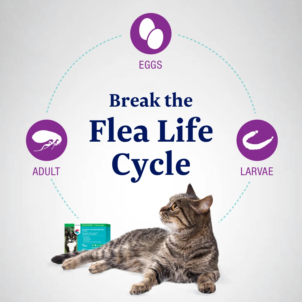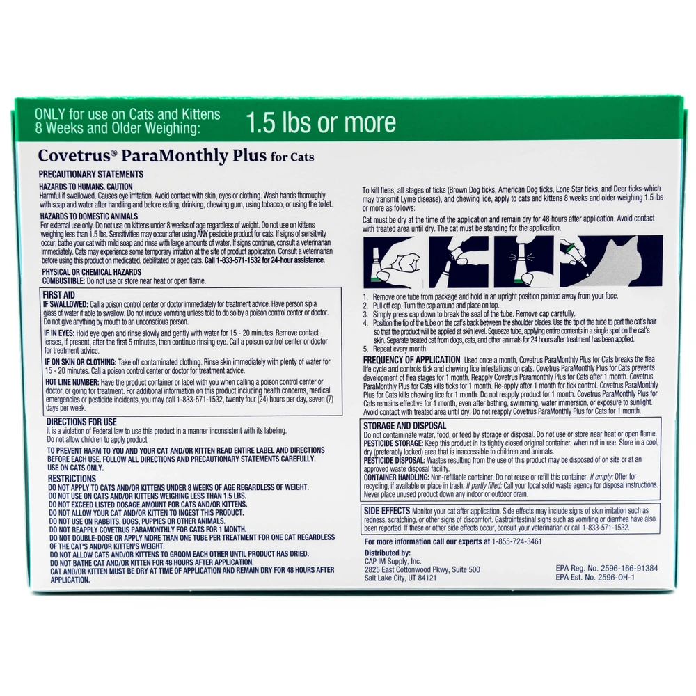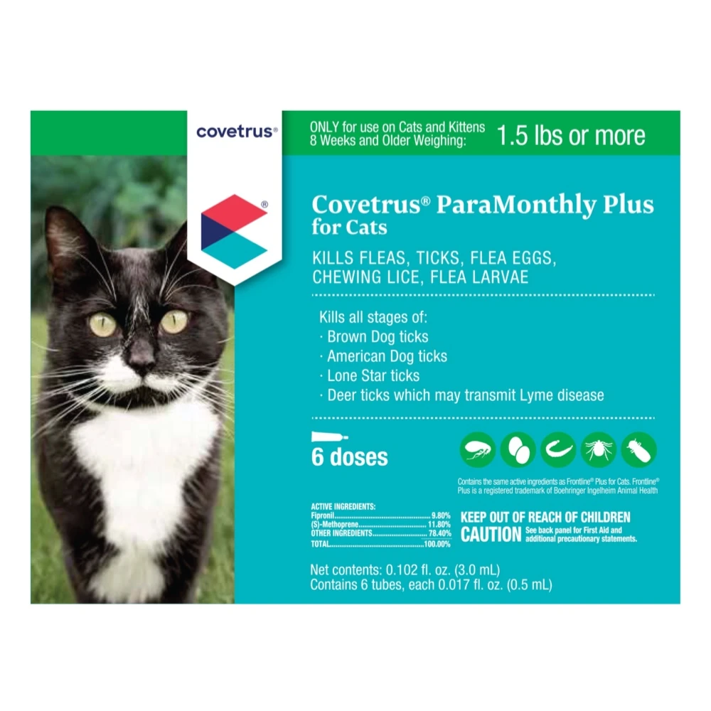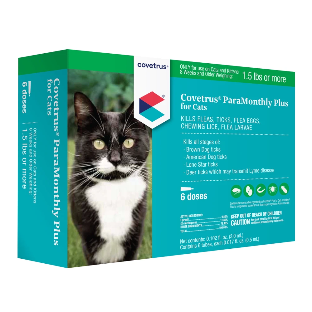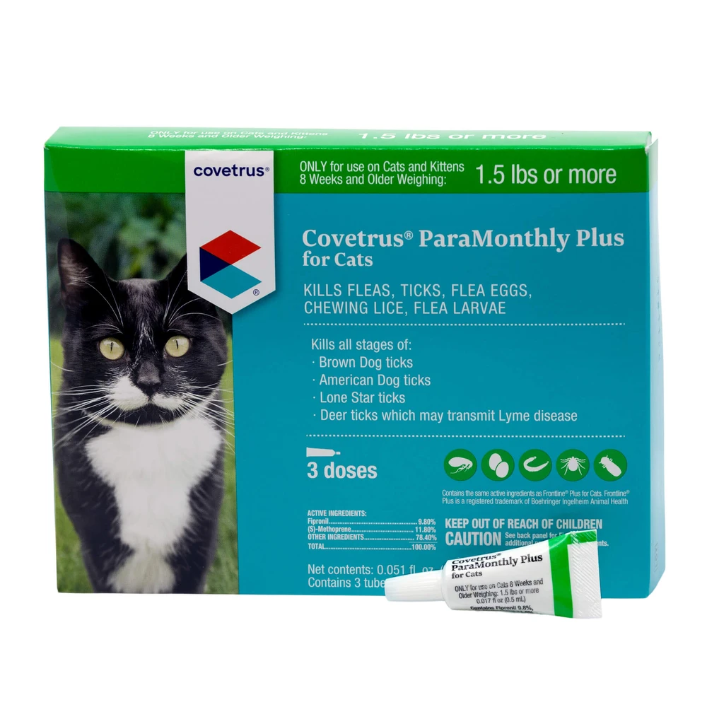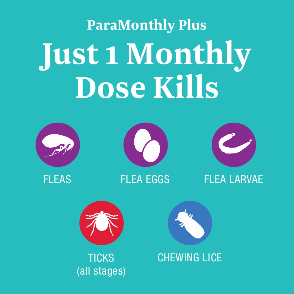 ParaMonthly Plus for Cats is a monthly, waterproof, topical formula that: Kills fleas, ticks, flea eggs, chewing lice, and flea larvae; Kills all stages of ticks, including Brown Dog, American Dog, Lone Star, and Lime Disease causing Deer ticks.