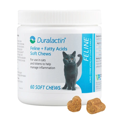 Duralactin Feline + Fatty Acids Soft Chews are for use in cats and kittens to help support health skin and manage inflammation. Duralactin® Feline + Fatty Acids Soft Chews contain MicroLactin®, an exclusive dried milk protein concentrate derived from hyperimmunized cows which contains factors that appear to block cytokines and inhibit neutrophil participation in the inflammatory response. Duralactin® Feline + Fatty Acids Soft Chews contain Omega 3 and Omega 6 Fatty Acids to support normal activity and wellness.