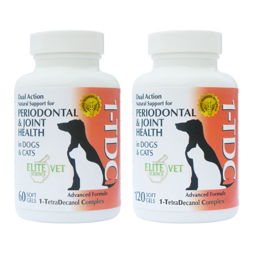 NEWLY REFORMULATED into a TWIST OFF! 1-TDC® stands for 1-TetraDecanol Complex, its molecular name. 1-TDC® Dual Action is a new generation of fatty acid oils with a different molecular structure and properties that are far superior to traditional essential oils. It is a unique Dual Action natural product that simultaneously addresses both GUM & JOINT HEALTH in dogs and cats. These easy-to-use convenient 1-TDC™ Dual Action soft gels provide superb results. Healthy joints keep your little companions happy. Joint health is at the core of their mobility — to play, go up and down stairs, or hop in and out of a car. Keeping joints healthy sustains their youthful spirit. You owe it to them to provide our most advanced all-natural solution. Gum health is a major issue in cats and dogs. It is reported that 80% of cats and dogs have a periodontal issue in some form by the age of three. 1-TDC® is a genuine periodontal breakthrough. It directly supports the gums, making it a unique and effective solution. While many products help with tartar and plaque, 1-TDC® is now the industry leader that directly targets the gums, the most important area of oral health.