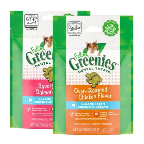 Promote better dental health in cats with FELINE GREENIES Dental Cat Treats! These treats were designed to help keep your cat’s teeth clean and healthy. The crunchy texture of these irresistible cat snacks helps clean teeth, reduce tartar buildup, and freshen cat breath, letting you enjoy cuddle time even more.
