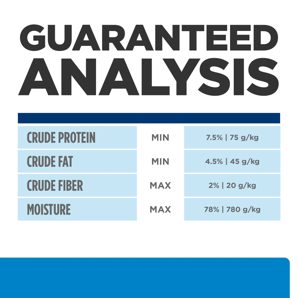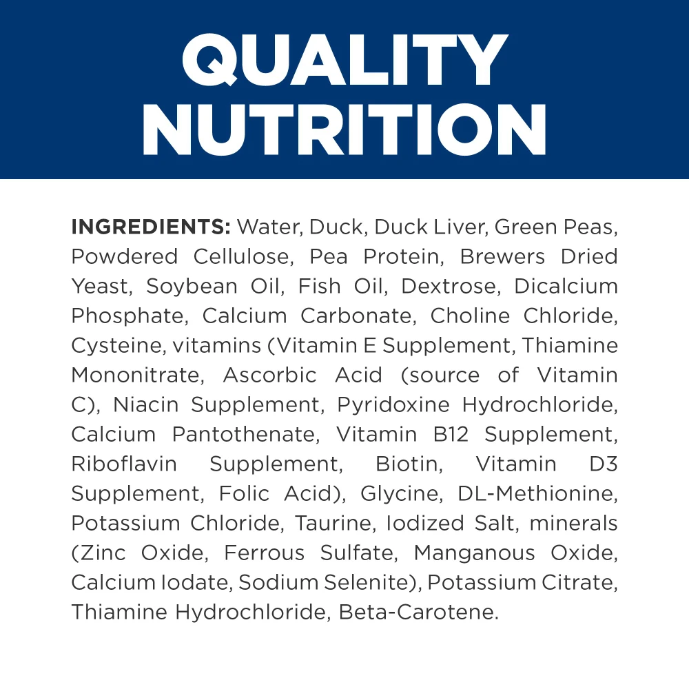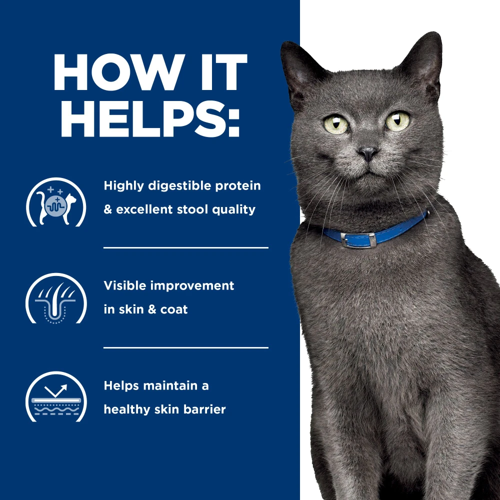 Help ease your cat’s skin condition or food allergy and intolerance with the nutritional formulation of Prescription Diet d/d canned cat food. This veterinary formula includes enhanced levels of Omega-3 fatty acids and antioxidants, which have been shown to be useful for pets with a variety of inflammatory skin conditions that are often associated with excessive itching, scratching and licking. Food allergy and intolerance may result in numerous skin and stomach problems that can cause discomfort and pain in your cat. This condition, also known as an adverse reaction to food, is usually an abnormal response to the protein found in many pet foods. Prescription Diet d/d comes with novel protein sources (new to your cat) to help manage adverse reactions to food. Commonly, reactions occur as a result of beef, dairy products and wheat. Prescription Diet d/d foods contain none of these allergens. The nutritional formulation of Prescription Diet d/d may also be useful for pets with a variety of conditions.