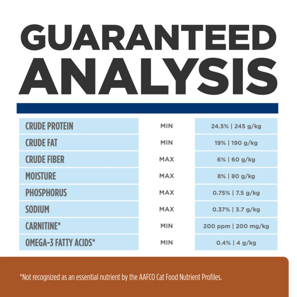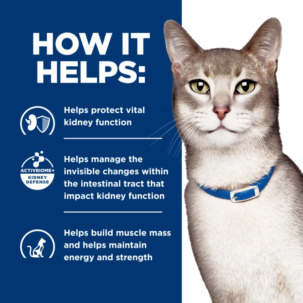 Hill’s Prescription Diet k/d Dry Cat Food with ActivBiome+Kidney Defense is specially formulated by nutritionists & veterinarians to help manage Chronic Kidney Disease (CKD). A proprietary blend of prebiotics activate the gut microbiome to reduce harmful waste products within the intestinal tract that impact vital kidney function, slowing the progression of the disease and is clinically proven to improve & lengthen quality of life.Prescription Diet k/d Dry Cat Food was developed with Enhanced Appetite Trigger (E.A.T.), which is clinically tested to stimulate appetite & increase food intake of cats with kidney disease. In addition to high levels of essential amino acids and L-carnitine, increasing caloric intake will support the cat’s natural ability to build muscle mass daily. This dry food is made with ocean fish and has an irresistible taste that cats love.
