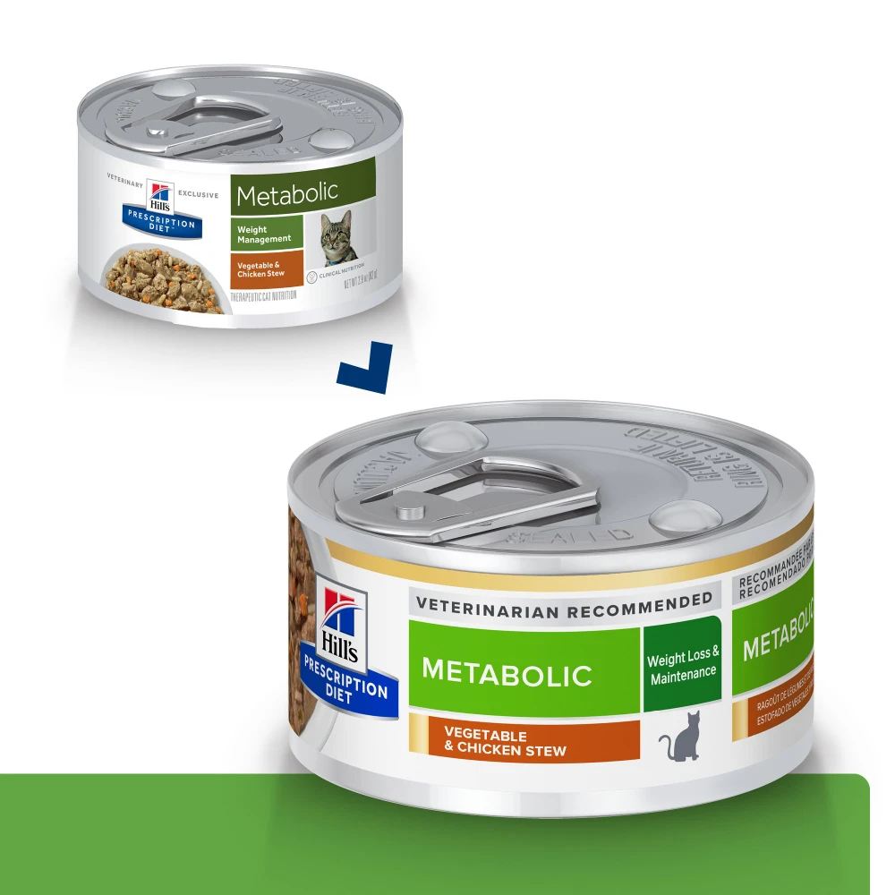 Prescription Diet® Metabolic dry cat food contains clinical nutrition specially formulated to manage your cat’s weight. This irresistible food makes it easier for you to bond with your pet with gently cooked, bite-sized chunks of real tuna or chicken & natural ingredients with added vitamins and minerals.