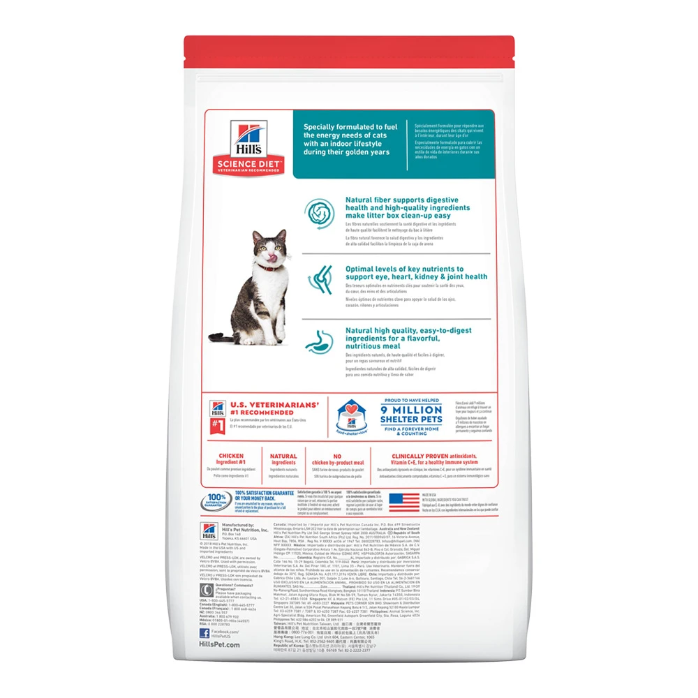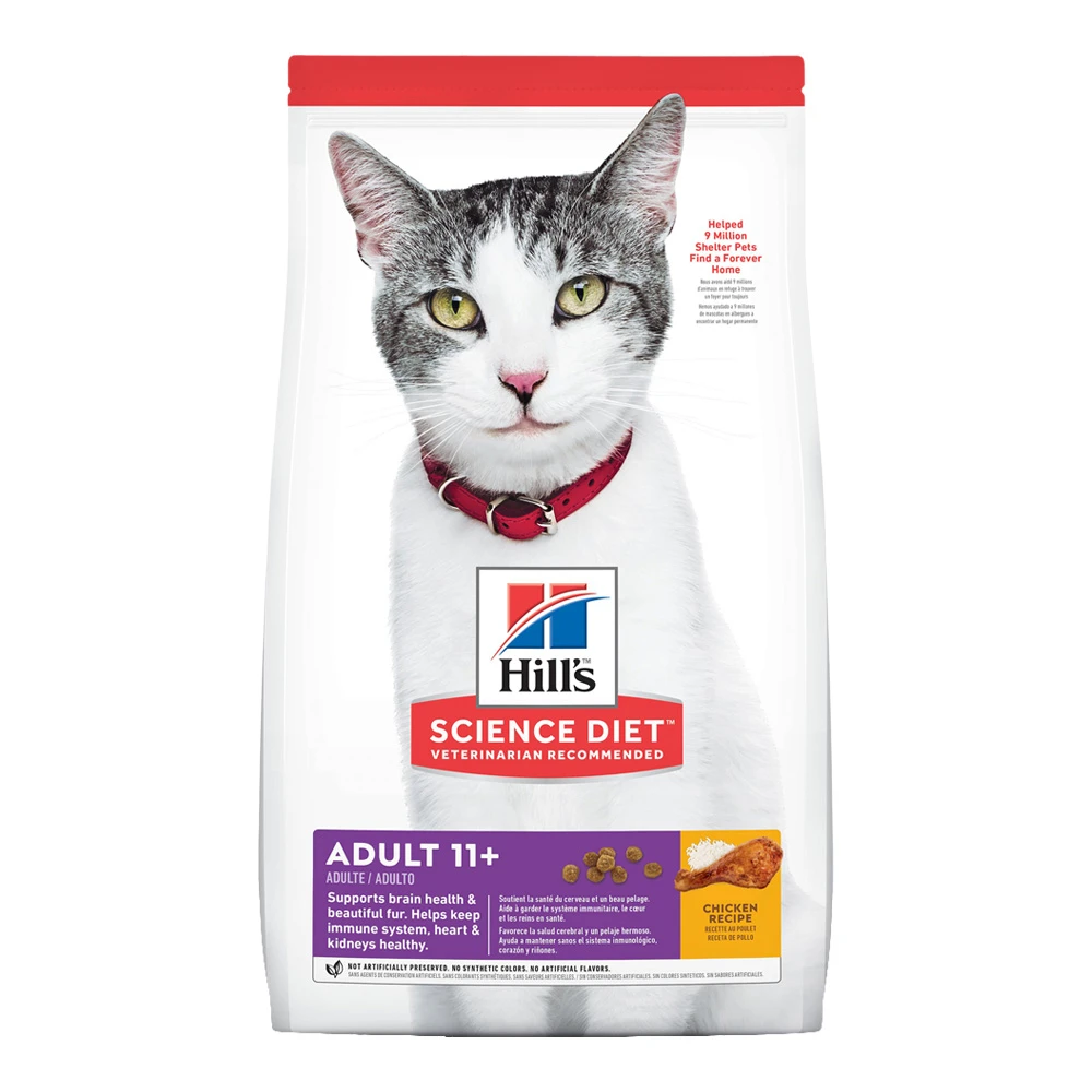 Hill’s Science Diet Senior 11+ cat food provides breakthrough, tailored nutrition for your 11+ cat for a healthy and happy life. It fights 4 important signs of aging in as little as 30 days. Typical signs of aging include more accidents in house, sleeping more, less agility, and less interaction with owner. It also contains an exclusive antioxidant bundle which helps defend the body and brain against aging, and is also rich in Omega-6 fatty acids to help promote soft skin & radiant coat.