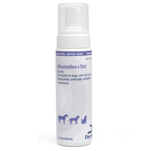 MiconaHex+Triz® Mousse is formulated for the support of healthy skin for dogs, cats and horses with conditions responsive to miconazole and/or chlorhexidine. Ceramides aid in moisturizing, repairing, and restoring dry, damaged skin.