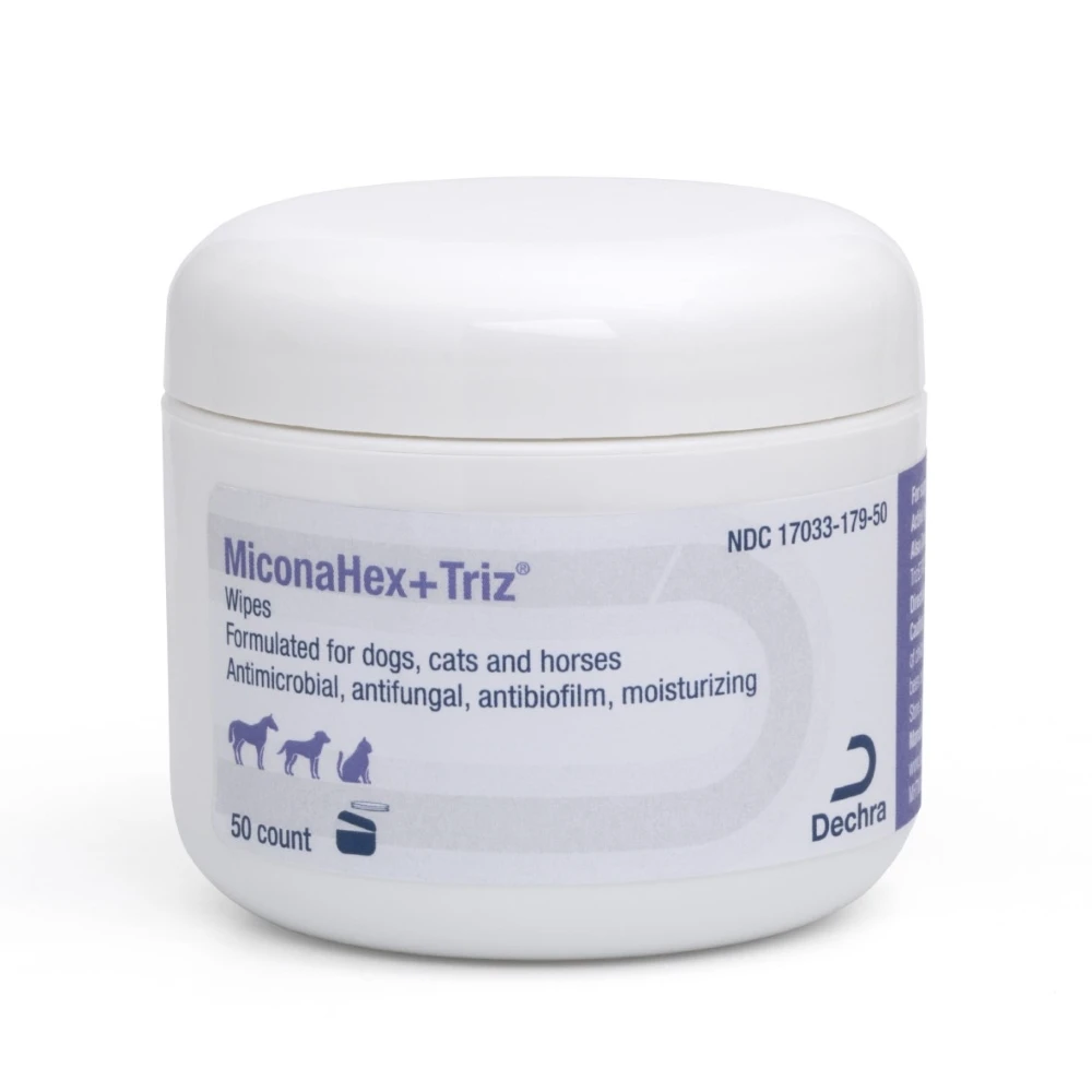 MiconaHex+Triz™ Wipes support healthy skin in animals by aiding in moisturizing, repairing, and restoring dry, damaged skin. These wipes are for use on dogs, cats and horses where conditions are responsive to miconazole and/or chlorhexidine.