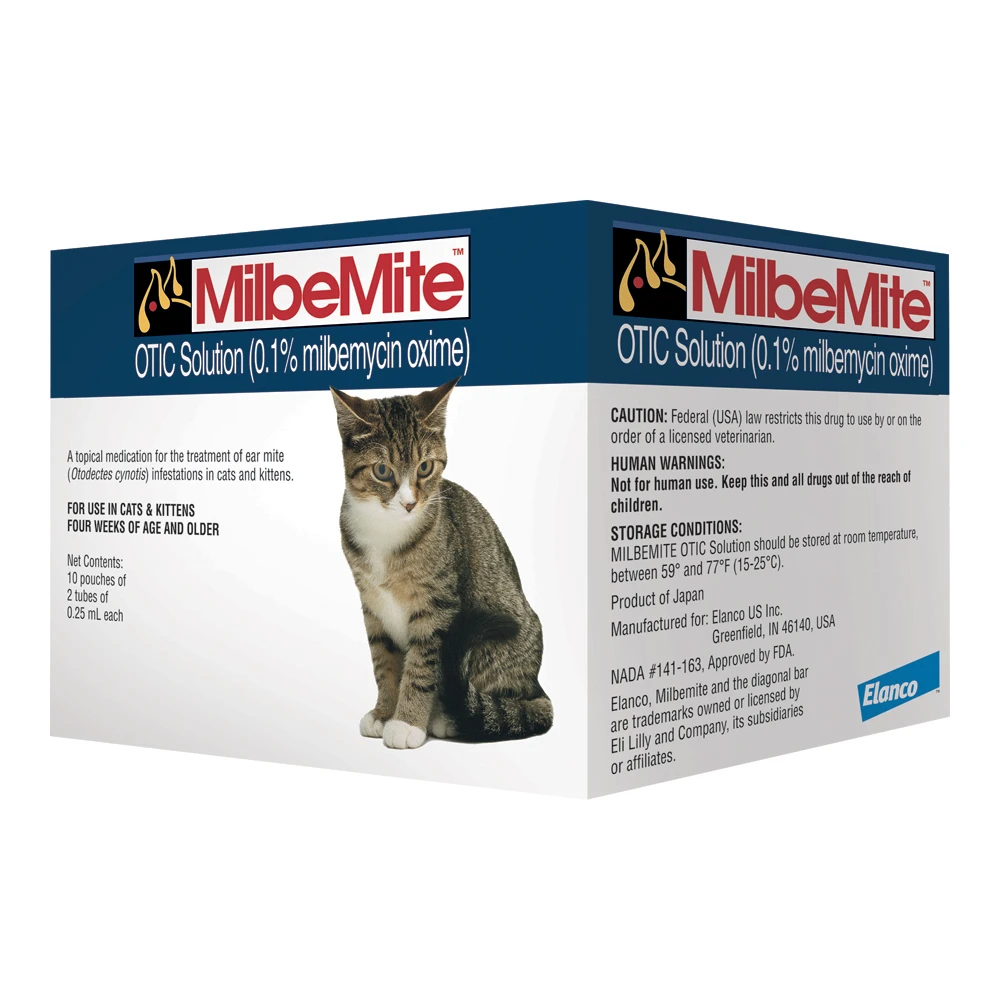 Milbemite Otic Solution is indicated for treatment of ear mite (Otodectes cynotis) infestations in cats and kittens four weeks of age and older. Effectiveness is maintained throughout the life cycle of the ear mite. Each pouch contains 2, 0.25 mL vials.