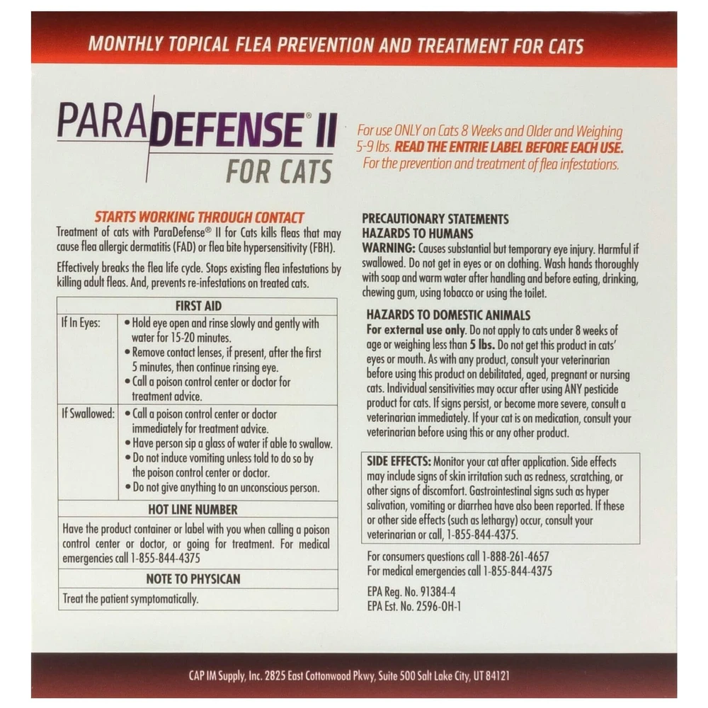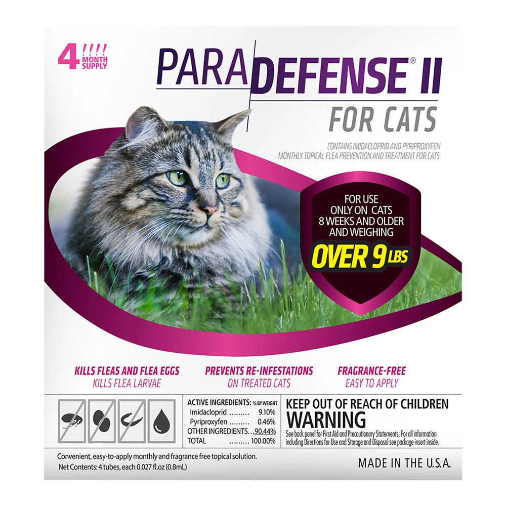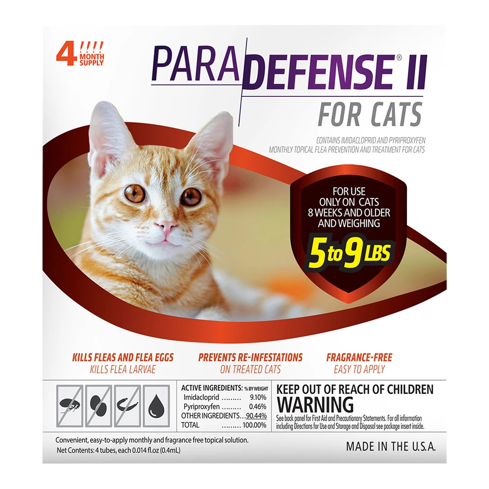 Effectively stop the flea life cycle in its tracks with PARADefense® II for Cats. PARADefense® II for Cats starts working on contact to kill all flea lifestages including flea eggs. PARADefense® II for Cats breaks the flea cycle by preventing the eggs, pupae and larvae from maturing. It is a once-a-month, fragrance-free topical application to cats or kittens 8 weeks and older weighing 5 or more pounds.