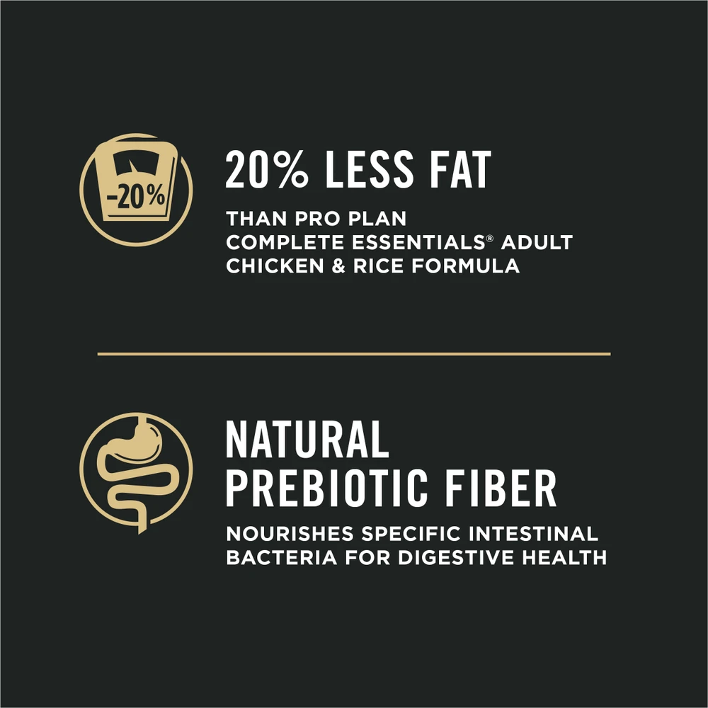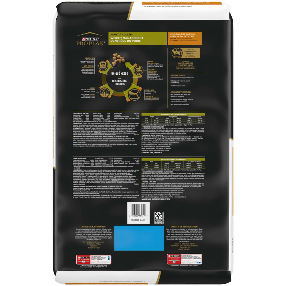 Give your cat the targeted nutrition she needs to thrive and be her best self with Purina Pro Plan Weight Management Chicken & Rice Formula adult dry cat food. This weight control cat food is formulated with 43 percent protein to maintain her lean muscle mass during weight loss, and it contains 20 percent less fat than our Purina Pro Plan Complete Essentials Adult Chicken and Rice formula to help her maintain a healthy weight.