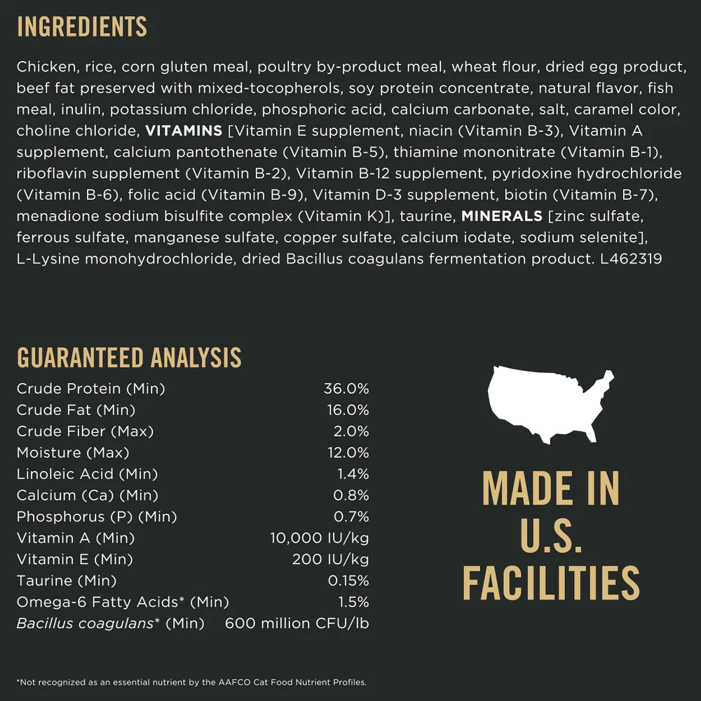Satisfy your cat’s palate with Purina® Pro Plan® COMPLETE ESSENTIALS Chicken and Rice Formula adult cat food dry kibble. Our high protein cat food dry formula is made with high-quality protein, including chicken as the first ingredient, and contains guaranteed live probiotics to support her digestive and immune health. This adult cat food dry recipe includes 36 percent protein to help meet her unique nutritional needs, and every high-quality ingredient is carefully chosen for a specific purpose.