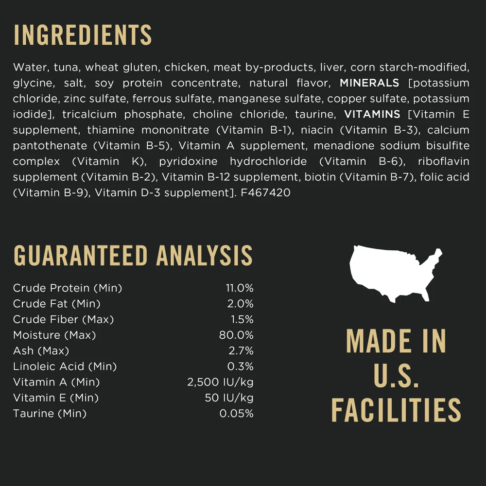 You can be confident she’s getting 100 percent complete and balanced nutrition for adult cats in a tuna cat food formula made with no artificial colors or preservatives. Every mouthwatering serving of this soft cat food gives your feline antioxidants to help support her healthy immune system and omega-6 fatty acids and vitamin A to nourish her skin and coat. Plus, we include vitamin A and taurine in our cat food with fiber to support healthy vision, and a high protein level helps her maintain lean muscle.