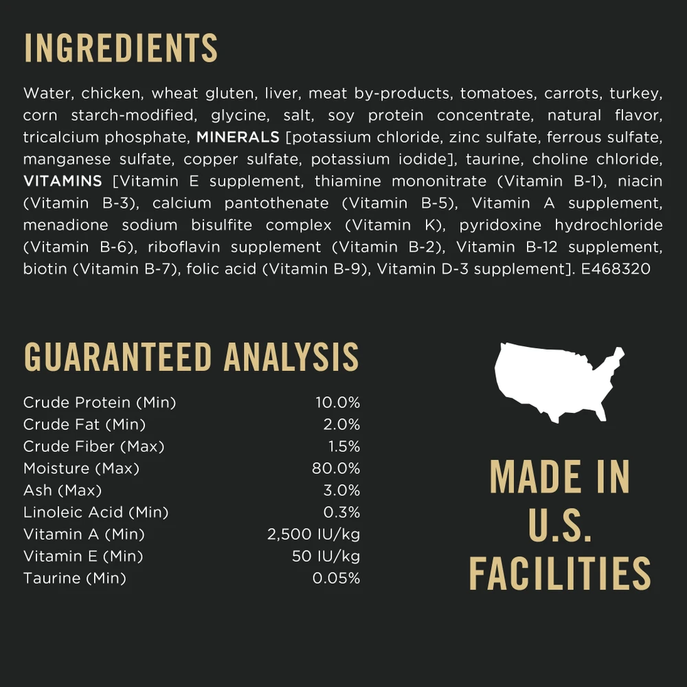 We formulate our soft cat food to provide 100% complete and balanced nutrition for adult cats in a delicious formula with no artificial colors or preservatives. A rich gravy gives this entree added flavor and moisture, while the tender texture and delectable taste combine to create a sensory experience your cat is sure to enjoy.