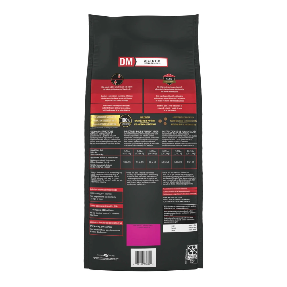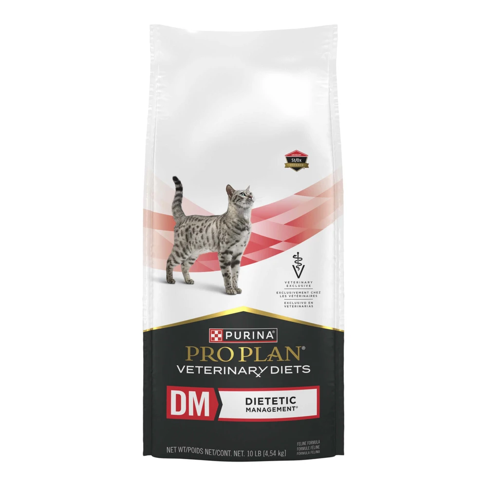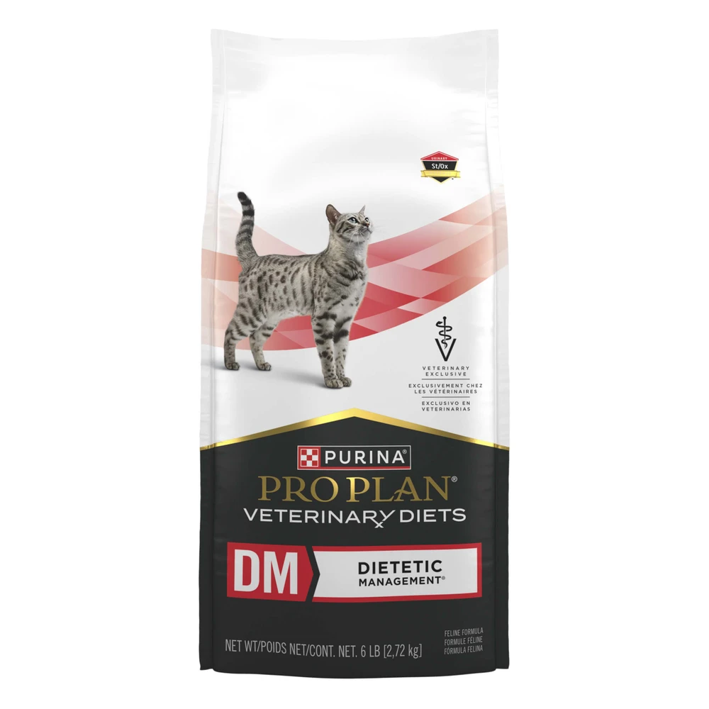 Purina Pro Plan Veterinary Diets DM Dietetic Management Feline Formula provides complete and balanced nutrition for the management of adult cats with Diabetes Mellitus or persistent hyperglycemia. The concentrated, high quality protein provides essential amino acids, low carbohydrates, and a high level of Vitamin E.