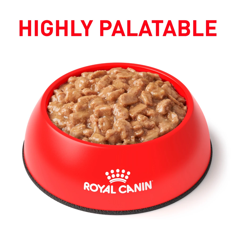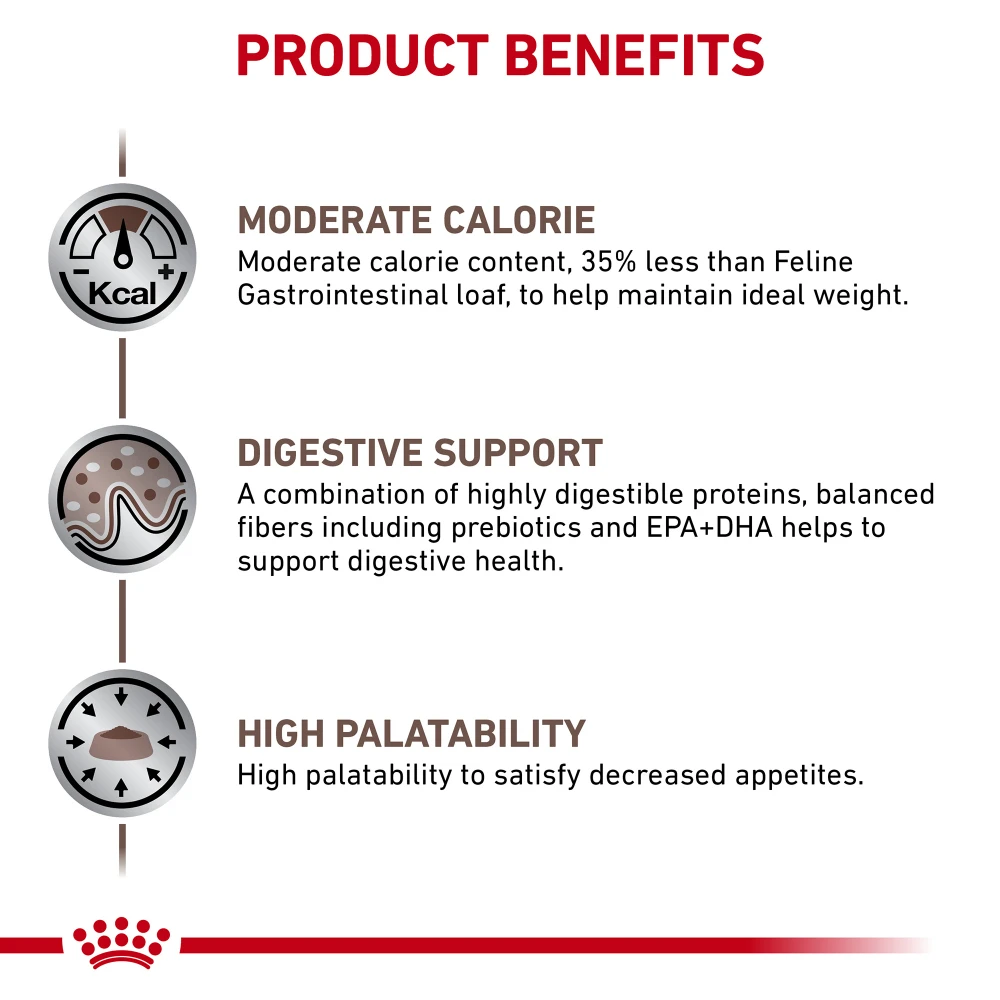 Royal Canin Gastrointestinal Moderate Calorie wet cat food is palatable, digestible thin slices in gravy canned wet cat food, formulated with lower calories* for healthy weight maintenance—especially in cats with a tendency to become overweight. Prebiotics help maintain the balance of good bacteria in the gut. A blend of dietary fibers, highly digestible ingredients, and an adapted level of electrolytes helps support cats with gastrointestinal signs, including vomiting and diarrhea. Omega-3 fatty acids, EPA and DHA, from fish oil help nourish and soothe the GI tract. And the exclusive S/O Index supports urinary health by creating an environment unfavorable to crystal formation in the bladder. (* 35% lower calories compared to Royal Canin Feline Gastrointestinal loaf cat food)