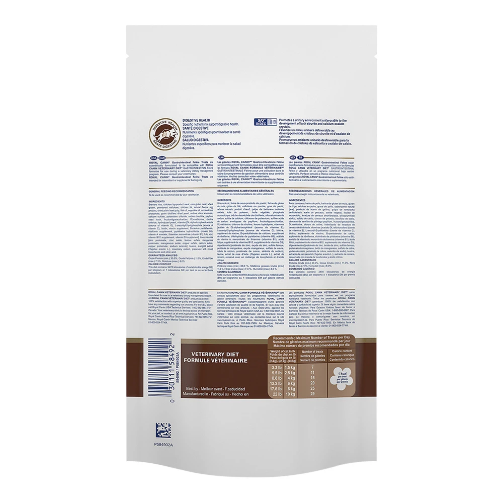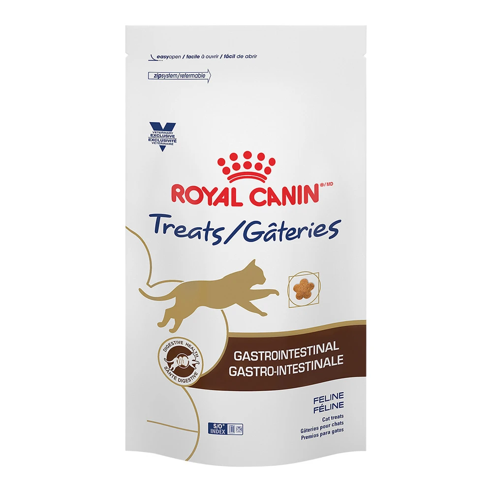 Royal Canin Gastrointestinal cat treats contain specific nutrients and an adapted calorie content to help promote digestive health and support a cat’s sensitive stomach. The GI treats are part of a comprehensive line of veterinary-exclusive formulas for a cat with gastrointestinal signs including diarrhea and vomiting. And at only 1 calorie per treat, they’re a great way for your clients to bond with their cat without interfering with their veterinary recommended diet. Healthy treating tip: Treats should only make up 10% of a cat’s daily calorie intake. These treats are compatible with Gastrointestinal, Gastrointestinal Fiber Response, Gastrointestinal Kitten and Gastrointestinal Moderate Calorie.