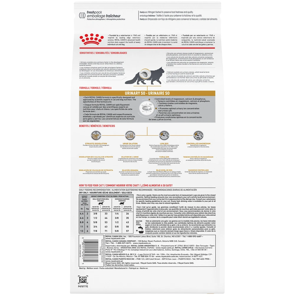 Royal Canin Urinary SO Dry Food for Cats is a veterinary-exclusive cat food that was developed to nutritionally support your adult cat’s urinary tract and bladder health. It increases the amount of urine your cat produces to help dilute excess minerals that can cause crystals and stones.