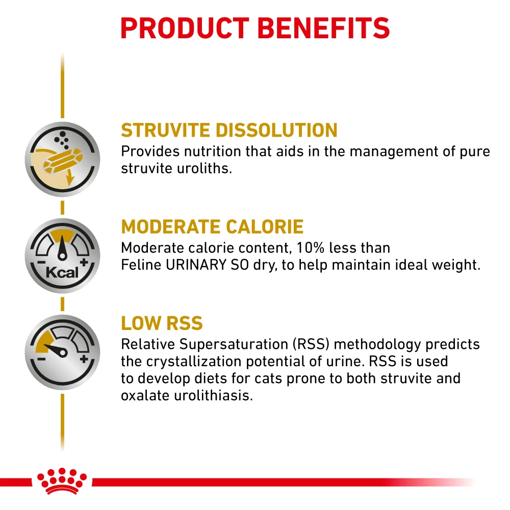 Relative Super Saturation (RSS) methodology is used to help lower ion concentration in urine, which contributes to stone formation. This formula promotes a urinary environment unfavorable to the formation of both struvite and calcium oxalate crystals.