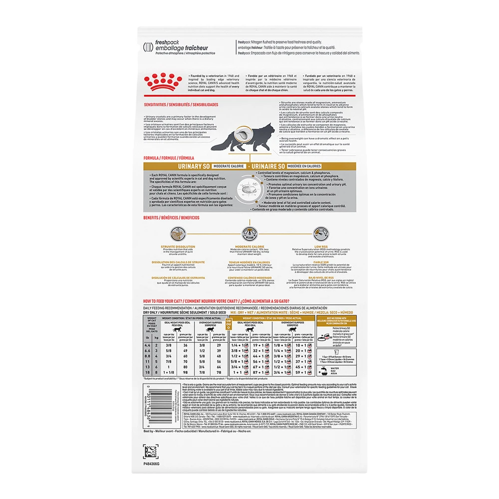Royal Canin Urinary SO Moderate Calorie Dry Food for Cats is a veterinary-exclusive dry cat food that was developed to nutritionally support your adult cat’s urinary tract and bladder health. It increases the amount of urine your cat produces to help dilute excess minerals that can cause crystals and stones. Moderate calorie content (10% less than Royal Canin Urinary SO dry cat food) helps them maintain a healthy weight.