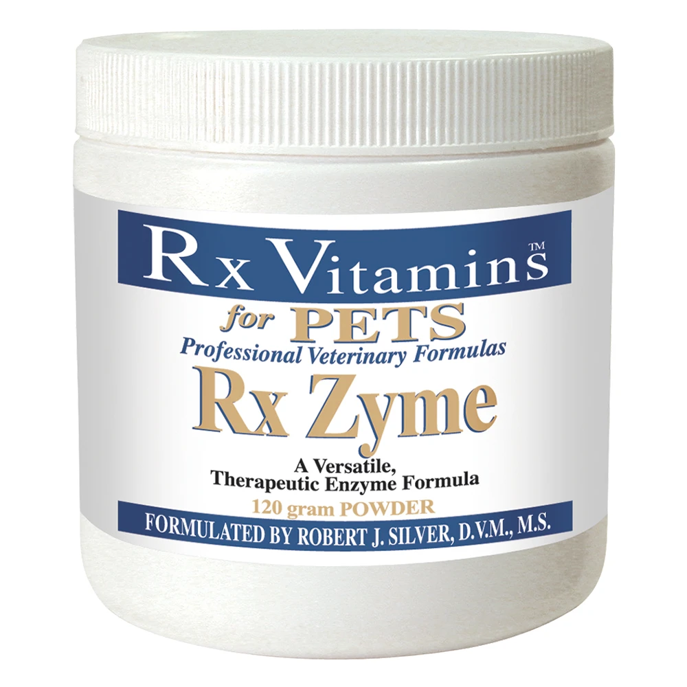 Rx Zyme features a proprietary, high-potency, digestive enzyme blend combined with selected nutraceuticals and botanicals designed to address overall digestive function, promote the breakdown and absorption of food and its nutrients and support the normal digestion of protein, fats and carbohydrates. Rx Zyme contains nutraceuticals targeted to reduce intestinal permeability and improve GI ecology and the GI immune system. Rx Zyme contains the free-form amino acid, taurine, which makes this formulation a perfect complement to home prepared diets, especially for cats.