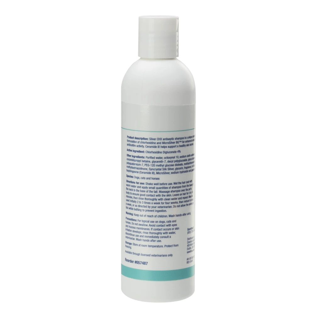 Silver CHX antiseptic shampoo is a unique proprietary formulation of chlorhexidine and MicroSilver BG™ for enhanced antiseptic and antibiofilm activity. Ceramide III helps support a healthy skin barrier. For use in dogs, cat, and horses.