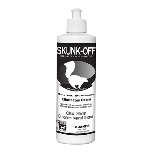 Stops skunk odor promptly and permanently on contact. Removes all trace of skunk spray from dogs, other pets, people, clothes, cars, homes-anybody or anything a skunk has sprayed or anything a skunk-sprayed animal has rubbed against. Skunk-Off does not contain enzymes, bacteria, nor oxidizers. It is nontoxic, nonirritating, biodegradable, and nonflammable. Skunk-Off can be used on dogs, cats, humans, your clothes, house, car, or anything.
