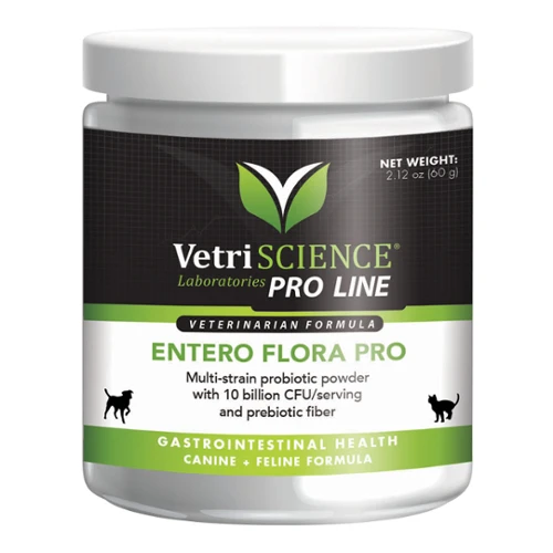 Entero Flora Pro is a proprietary multi-strain probiotic powder with prebiotic fructooligosaccharides (FOS) to support digestion, regularity and healthy digestive and immune systems in dog and cats.