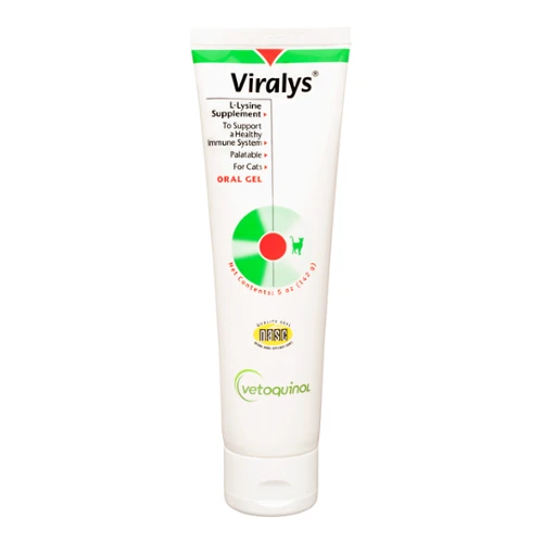 Viralys Gel is a Lysine supplement in a palatable flavor gel for cats. Viralys is recommended to support a healthy immune system and recommended for conditions responsive to L-Lysine. It also helps support respiratory health and helps maintain normal eye function and health. Each 1/4 teaspoon contains 250 mg of L-Lysine.